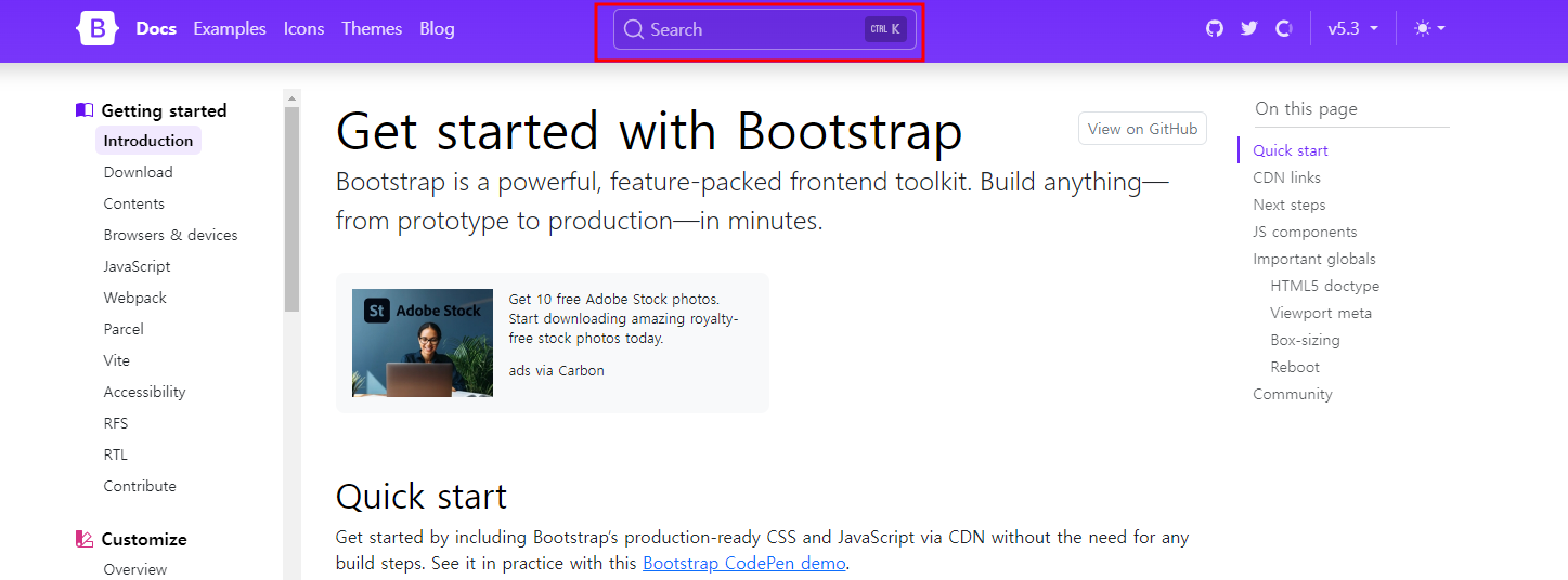 1. 부트스트랩 사이트를 들어간다. https://getbootstrap.com/docs/5.3/getting-started/introduction/ Get started with Bootstrap Bootstrap is a powerful, feature-packed frontend toolkit. Build anything—from prototype to production—in minutes. getbootstrap.com 2. CDN links 목록으로 가서 js와 css 코드를 복사해서 head 태그에 입력한다. 3. 부트스트랩 docs로 들어가서 원하는 디자인을 class로 가져와 원하는 태그에 적용하면 된다. https://getbootstrap.com/docs/5.3/getting-star..